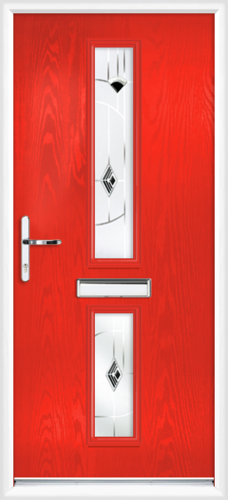 The Tyne (also known as the Garda A3 A2 Centre) composite front door features two central glass panels (one vertical glass panel in the top section and one slightly smaller panel in the bottom section) within a flat slab. The Tyne is one in a set of three composite door styles with a flat 'Garda' slab and two vertical glass panels, one atop the other, the Lancashire style having the glass on the handle side and the Rutland with the glass on the hinge side.